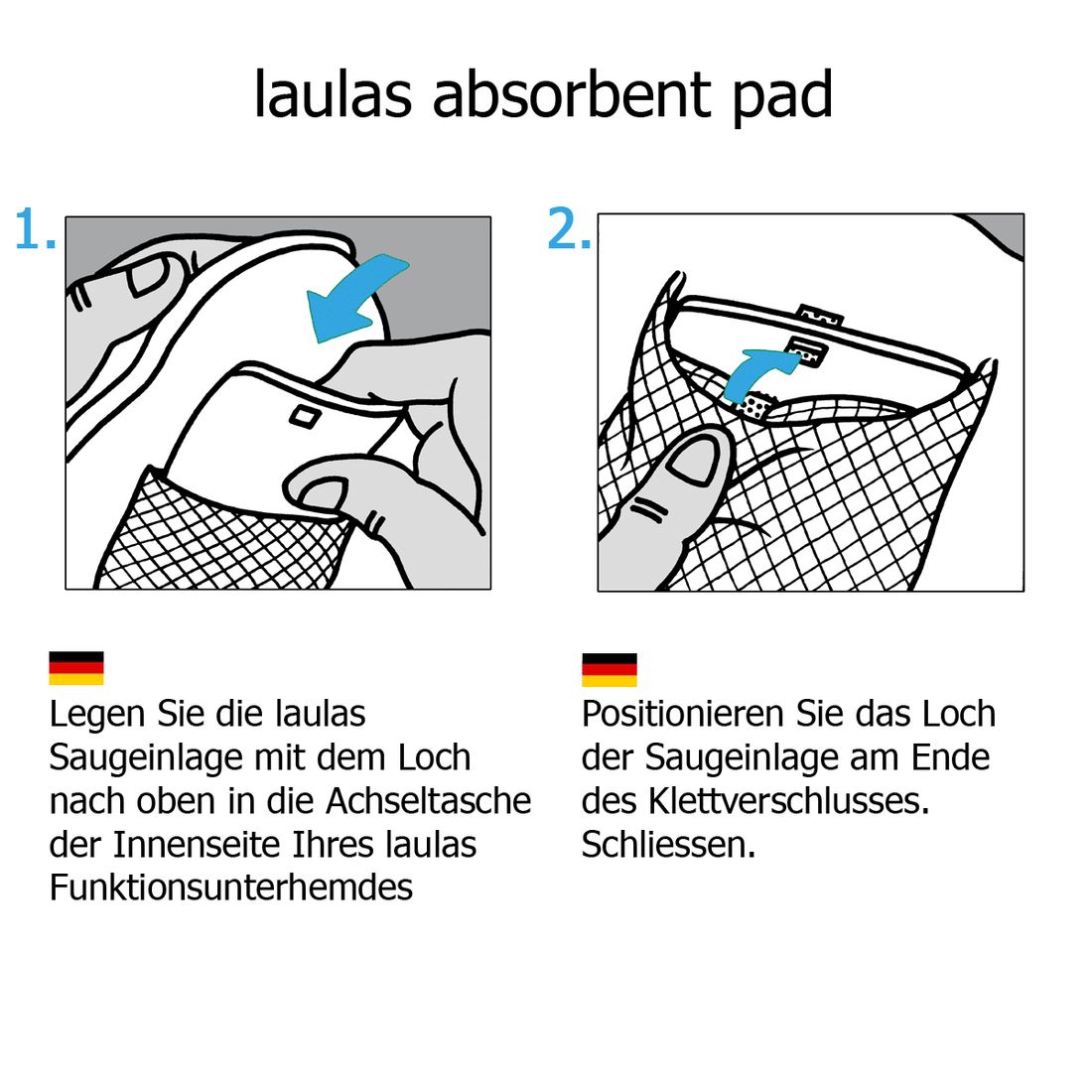 - Stufe 2 » Achseltasche mit wechselbarer Saugeinlage » laulas® Saugeinlagen mit Superabsorber-Fasern schließen den Schweiß sicher ein. Beim Wechseln entsorgen Sie sowohl den Schweiß als auch den Schweißgeruch!